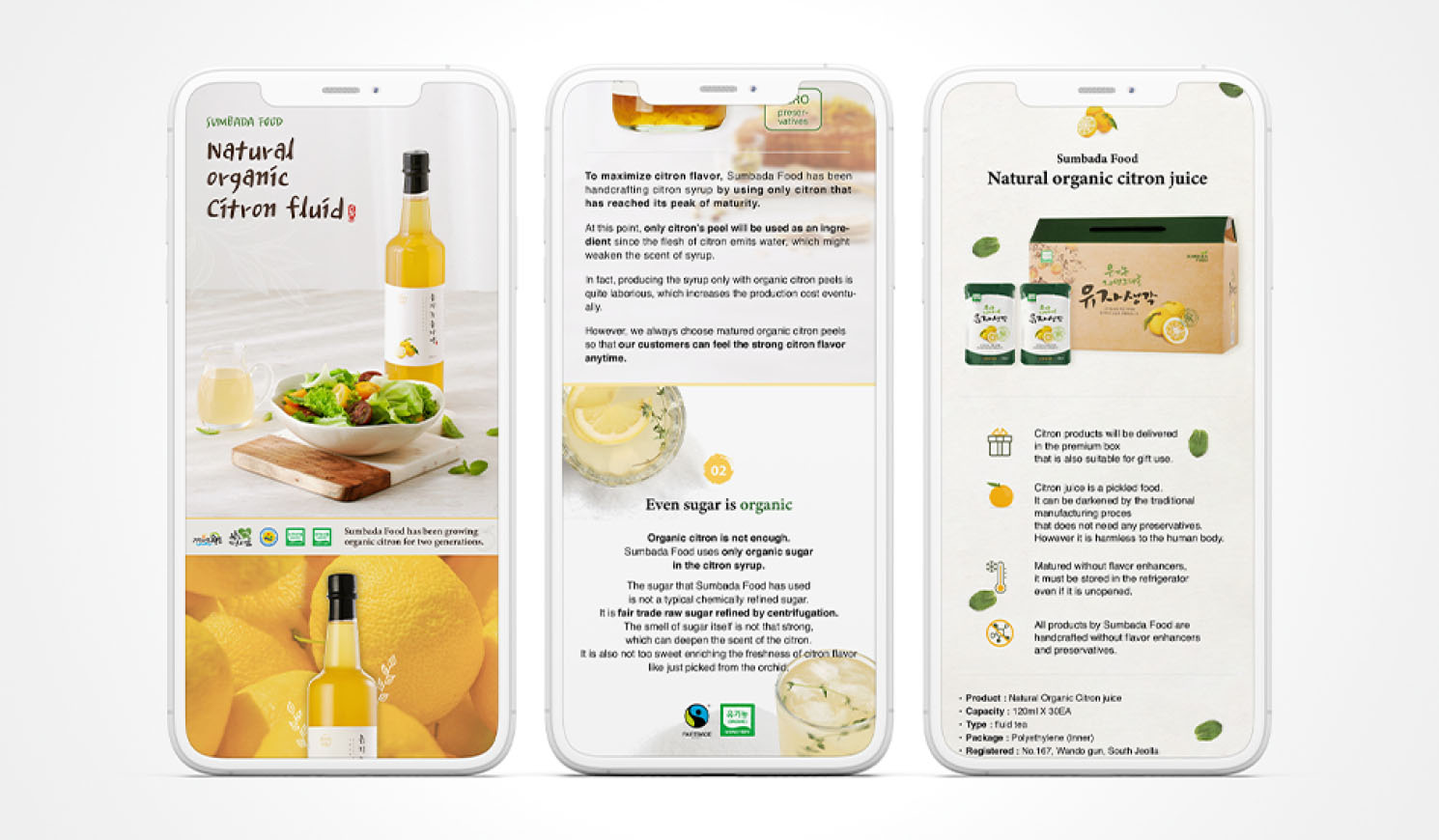 해외 각지로 보낼 영문 팸플릿과 상세페이지를 제작했습니다. 팸플릿의 경우 3가지 제품의 정보가 제한된 페이지 이내로 모두 담겨야 했기 때문에 제품 이미지는 해치지 않으면서 중구난방 하지 않도록 디자인했습니다. 팸플릿 내용 기획부터 제품 스튜디오 촬영, 자사몰 상세페이지, 팸플릿 제작까지 전 과정을 모두 핸들링했던 프로젝트입니다.