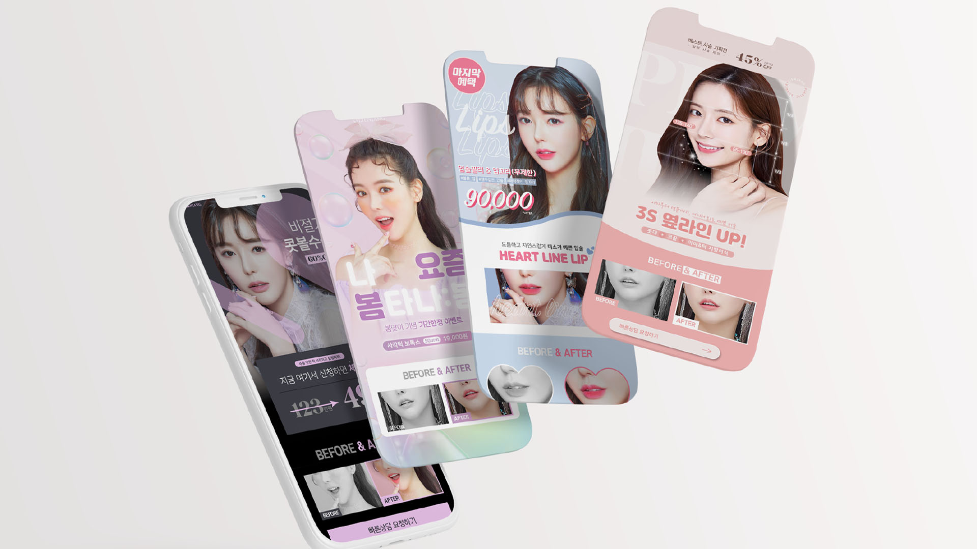 프리랜서로 활동하며 작업했던 성형외과 마케팅 배너와 랜딩 페이지입니다. 특정 부위만을 강조해야 하는 특성에 맞게 구성하며 한눈에 띄어야 하는 마케팅 배너 특성에 맞게 화려한 컬러를 위주로 사용했습니다.