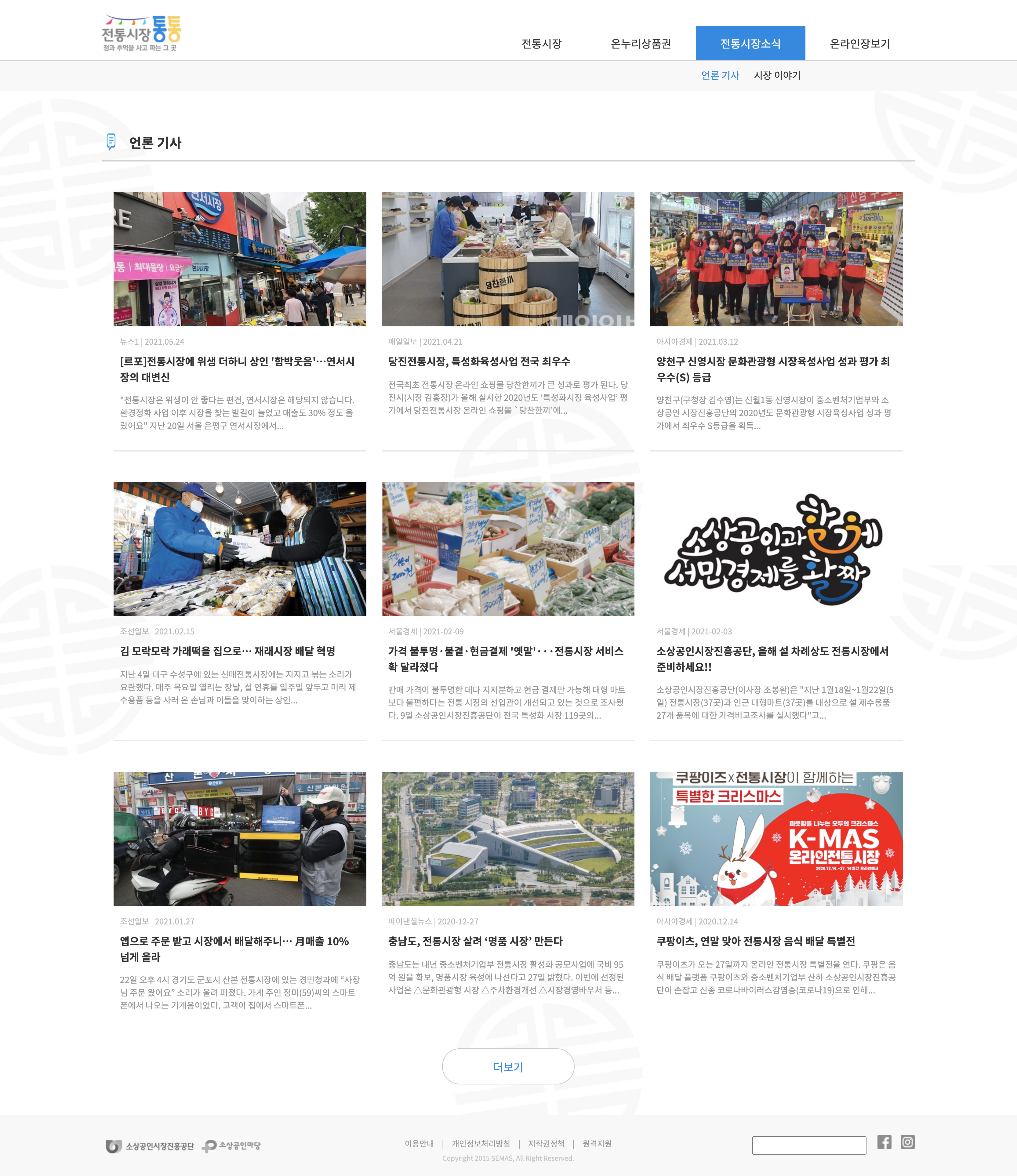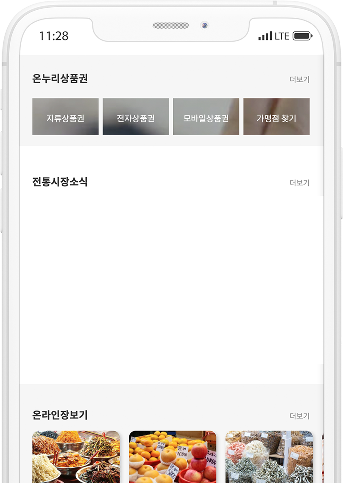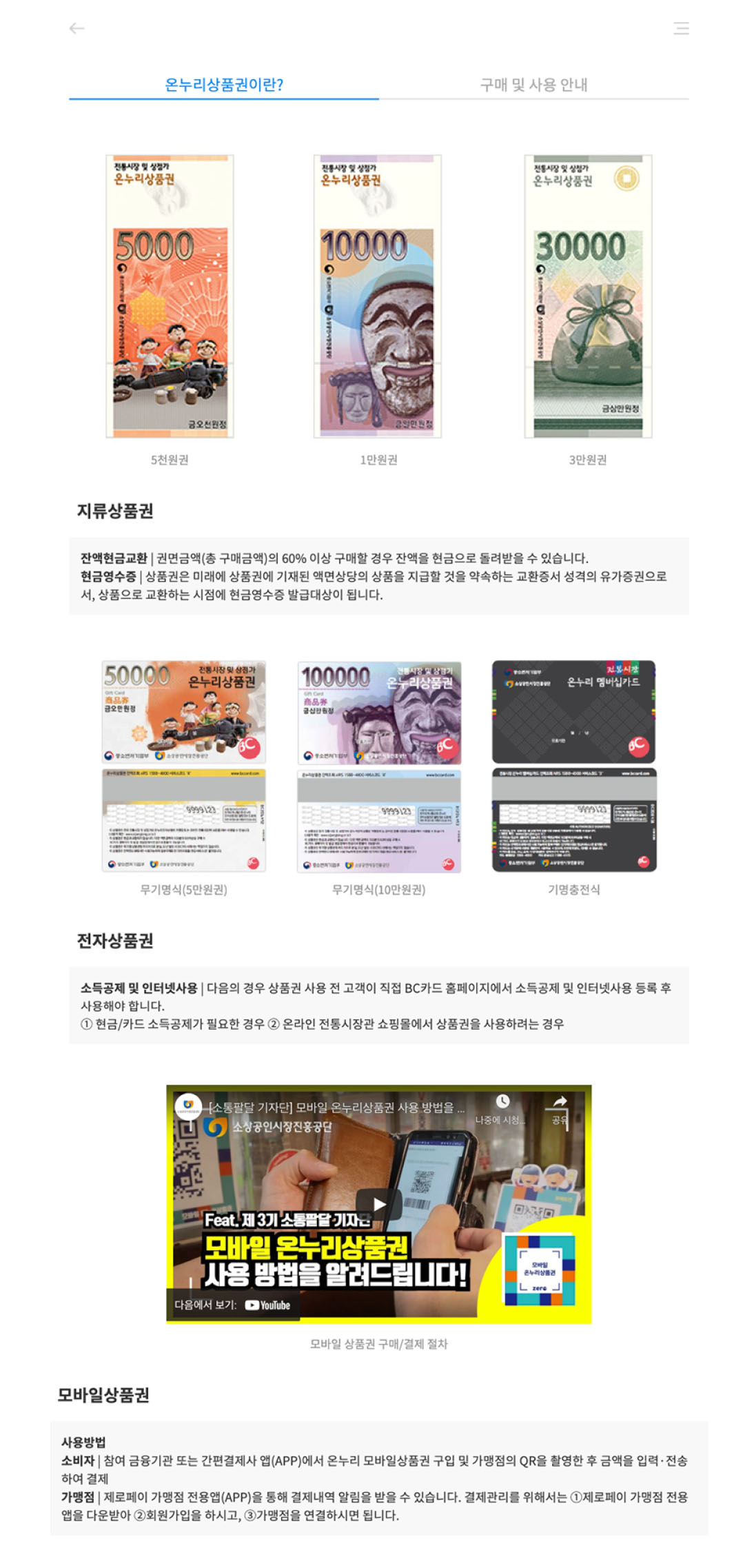 같은 포맷으로 반복되는 뉴스 이벤트 콘텐츠들은 데이터 JSON을 이용했습니다. JSON을 이용함으로써 뉴스가 새로 추가되더라도 내용 입력만 해주면 형식에 맞게 자동 등록될 수 있도록 제작했습니다. 디바이스 타입별로 다르게 3,2,1 행 콘텐츠를 나열해 적절한 크기로 이용할 수 있도록 하였고, 가독성 없이 정보만 나열되어 있던 온누리상품권 콘텐츠를 이미지와 함께 쉽게 정리했습니다.