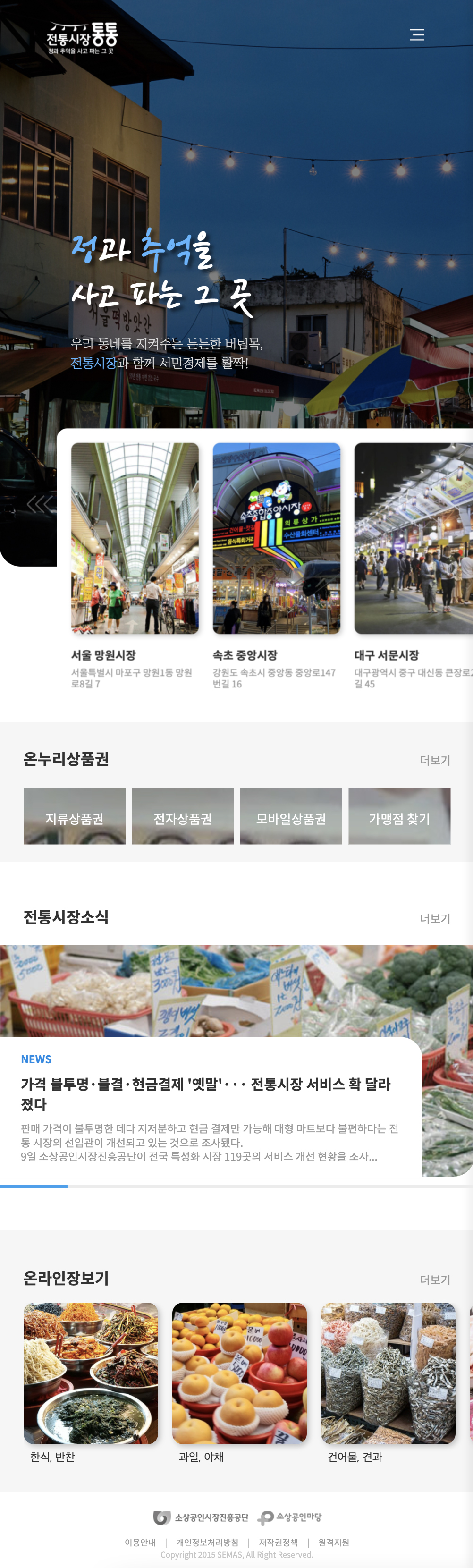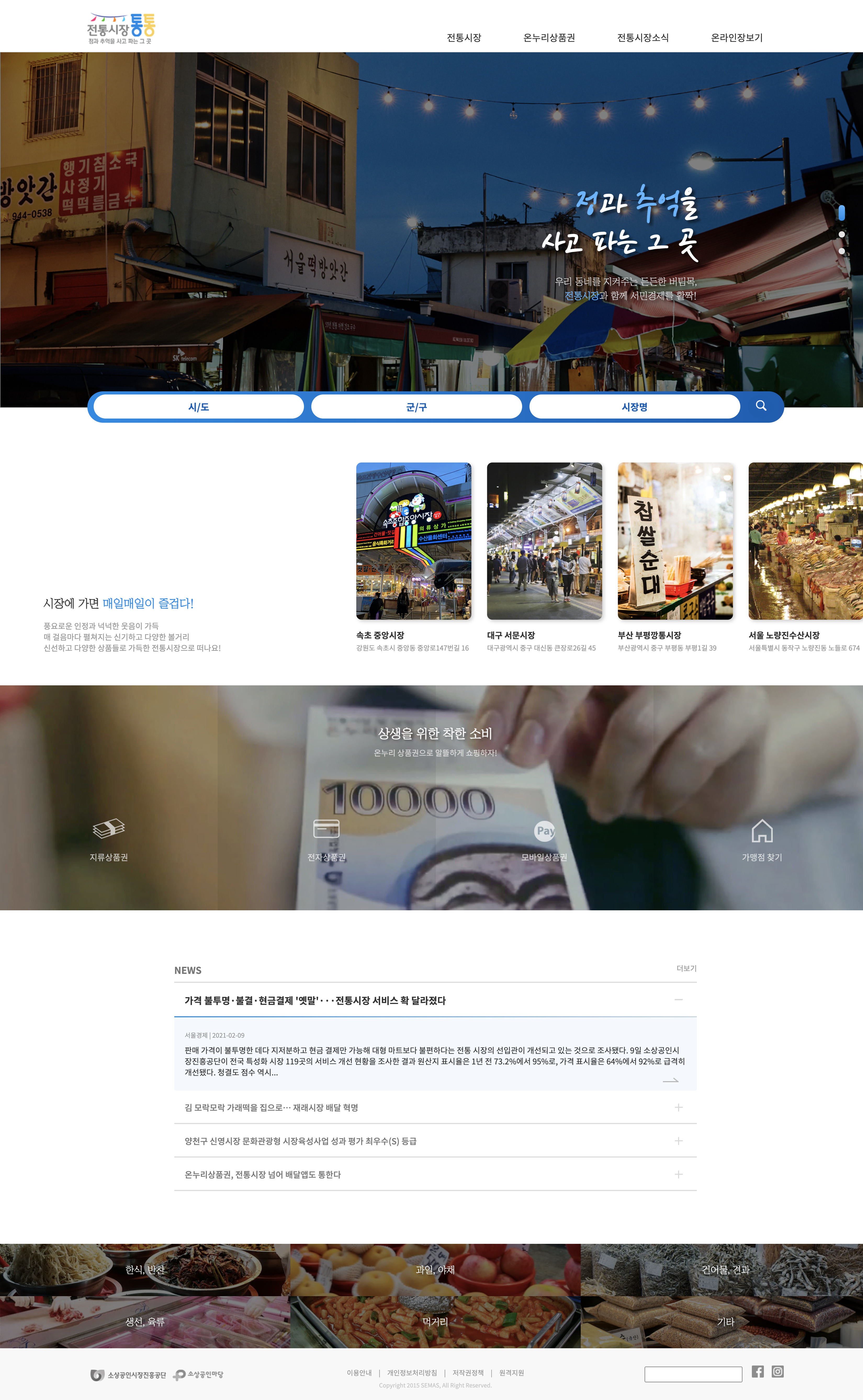 외국인 관광객이 즐겨 찾는 관광 명소 육성 대상으로 전통시장 20곳이 선정됐을 만큼 전통시장은 이제 더 이상 할머니, 할아버지들만의 장소가 아닙니다. 전 세대가 전통시장을 이용하기를 바라는 마음으로 현대화를 입혀 전통시장 사이트를 리뉴얼 하였습니다.