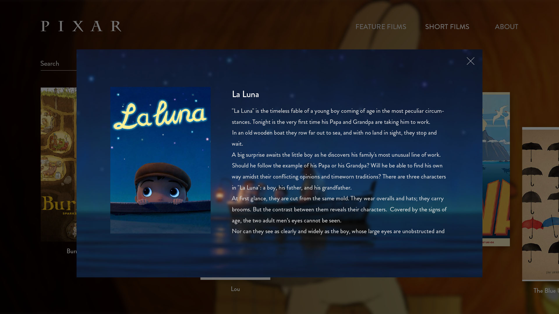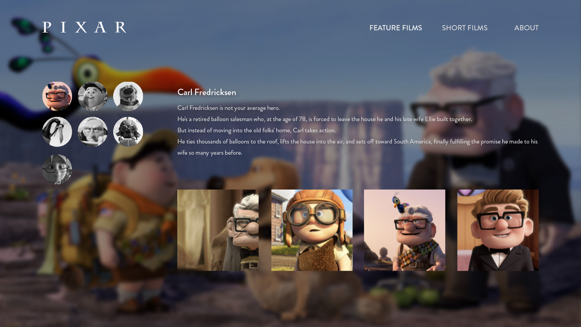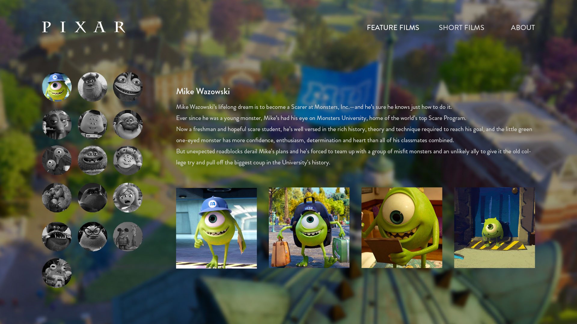 24개의 영화, 252개의 캐릭터, 캐릭터별로 4장씩 1008장의 사진을 JSON에 배열화시켜 입력 후에 Component 형태의 페이지로 구성하였습니다. 기존 픽사 사이트에서는 캐릭터 소개가 한 페이지에 쭉 나열되어 있었습니다. 그렇기 때문에 16명의 캐릭터를 소개하는 영화의 경우는 스크롤이 끊임없이 길어지는 불편함이 발생했습니다. 이를 개선하여 좌측에 캐릭터 얼굴 사진은 한 번에 배치, 특정 캐릭터를 찾기 위해 기나긴 스크롤을 한참 내려야 하는 불편함을 개선했습니다.
