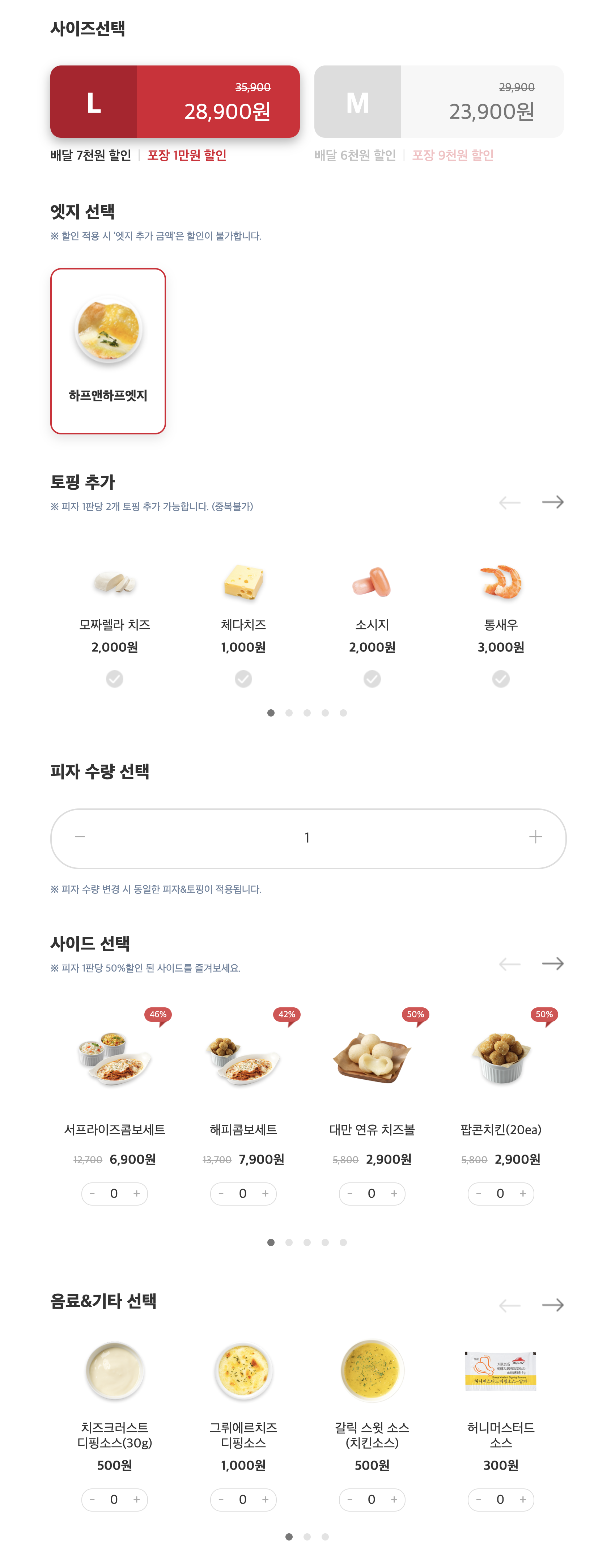 각 토핑 정보와 이미지를 JSON으로 뿌려주어 후에 어떤 토핑이 추가되어도 JSON 파일에만 기입하면 자동으로 등록될 수 있도록 작업했습니다. 체크박스는 img src를 찾아 변경해 주었고 토핑, 사이드, 음료 목록은 slick-slider 사용해 넘겨볼 수 있게 하였습니다.
